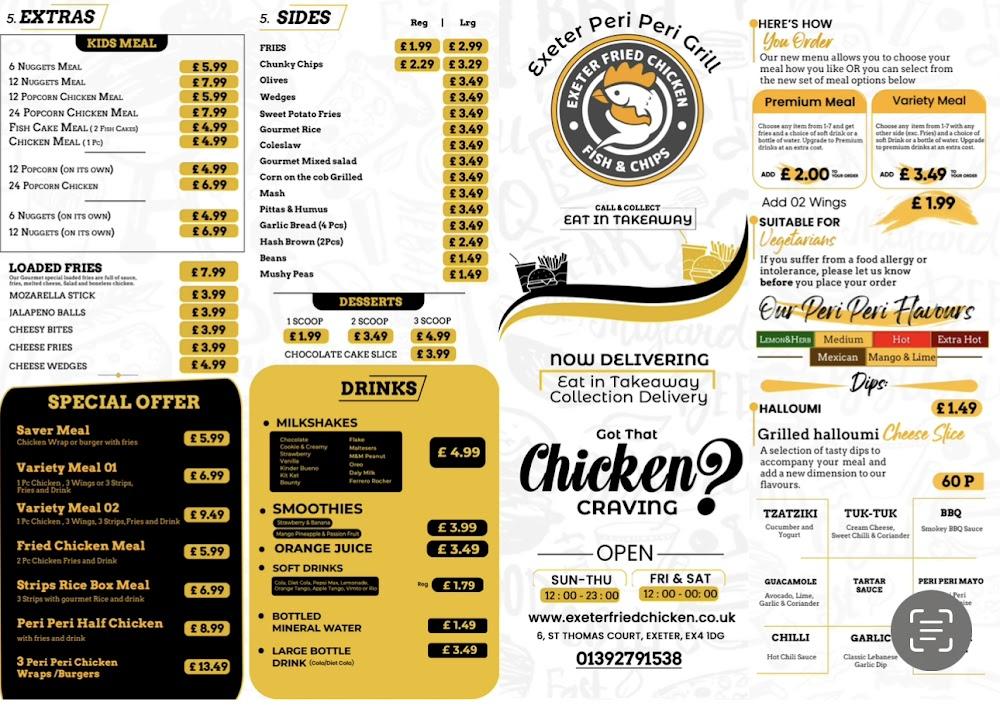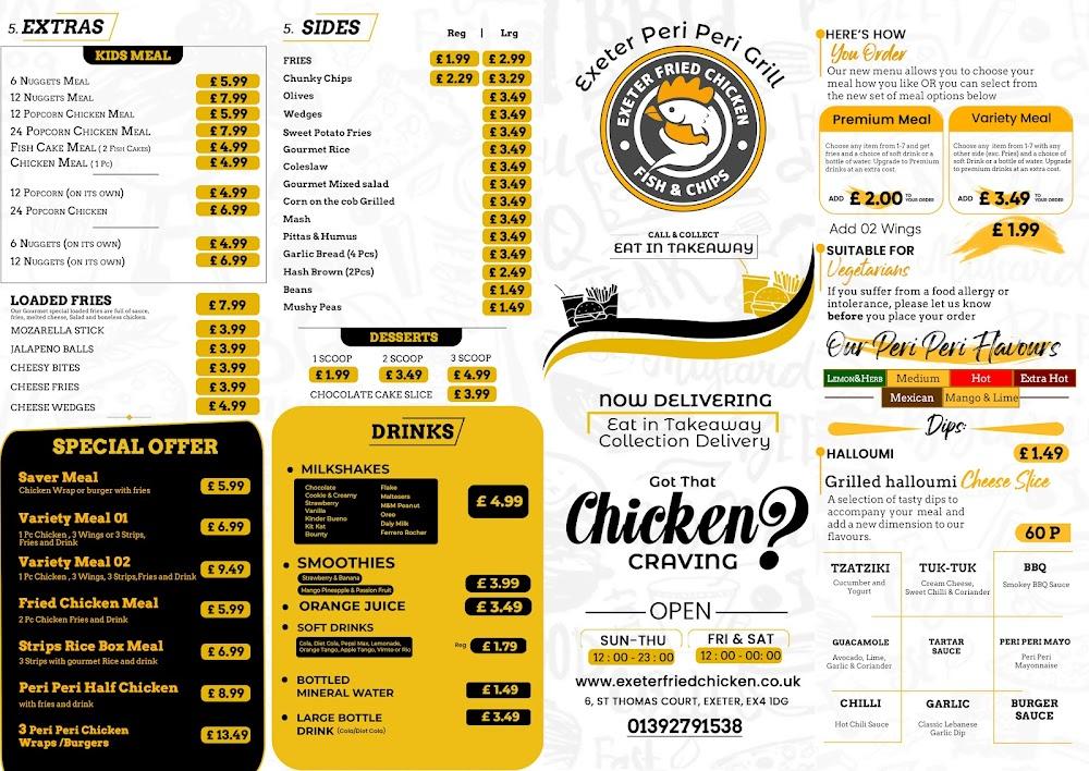 Exeter Fried Chicken and Fish & Chips sits in the heart of Exeter, conveniently located at Unit 6 St Thomas Court. This spot is easy to reach, making it a popular choice for locals and visitors alike. The atmosphere is casual, welcoming families and groups to enjoy a hearty meal together. With ample outdoor seating and a wheelchair-accessible layout, it's perfect for everyone. This restaurant prides itself on quick service, with options for no-contact delivery and takeaway. Whether it’s a weekday meal or a weekend feast, this place buzzes with energy, especially during peak lunch and dinner hours. Many patrons flock here for its high-quality offerings at such reasonable prices, creating a community of regulars who keep coming back for the deliciousness. Positive reviews highlight the freshness of the food, and the friendly staff often brighten the dining experience. Parking is free and convenient, making it a hassle-free stop when hunger strikes.